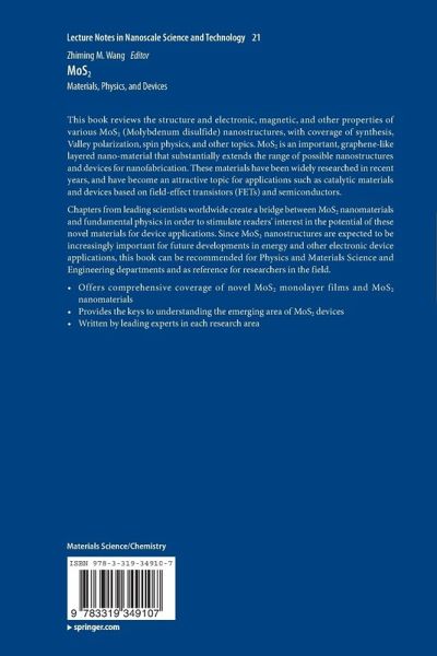 This book reviews the structure and electronic, magnetic, and other properties of various MoS2 (Molybdenum disulfide) nanostructures, with coverage of synthesis, Valley polarization, spin physics, and other topics. MoS2 is an important, graphene-like layered nano-material that substantially extends the range of possible nanostructures and devices for nanofabrication. These materials have been widely researched in recent years, and have become an attractive topic for applications such as catalytic materials and devices based on field-effect transistors (FETs) and semiconductors.