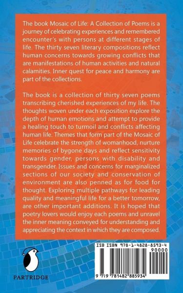The book Mosaic of Life: A Collection of Poems is a journey of celebrating experiences and remembered encounter’s with persons at different stages of life. The thirty seven literary compositions reflect human concerns towards growing conflicts that are manifestations of human activities and natural calamities. Inner quest for peace and harmony are part of the collections. The book is a collection of thirty seven poems transcribing cherished experiences of my life. The thoughts woven under each exposition explore the depth of human emotions and attempt to provide a healing touch to turmoil and conflicts affecting human life. Themes that form part of the Mosaic of Life celebrate the strength of womanhood, nurture memories of bygone days and reflect sensitivity towards gender, persons with disability and transgender. Issues and concerns for marginalized sections of our society and conservation of environment are also penned as for food for thought. Exploring multiple pathways for leading quality and meaningful life for a better tomorrow, are other important additions. It is hoped that poetry lovers would enjoy each poems and unravel the inner meaning conveyed for understanding and appreciating the context in which they are composed.