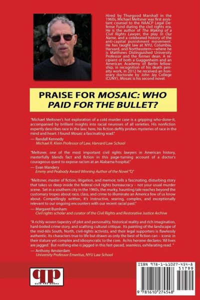 A life-changing crime story, Mosaic brings to life the compelling story of the 1960s murder of a charismatic woman doctor who courted danger trying to dismantle a racially segregated healthcare system in a large southern city. The search for who ordered the killing takes civil rights lawyer Christopher North to the centers of power, where a government intervention goes deadly wrong. It also forces him to confront the meaning of revenge-she wasn't just a client to him-for a crime that occurs at the intersection of hate and greed. "Michael Meltsner's hot exploration of a cold murder case is a gripping who-done-it, accompanied by brilliant insights into racial neuroses of all varieties. His nonfiction expertly describes race in the law; here, his fiction deftly probes mysteries of race in the mind and heart. I found Mosaic a fascinating read." - Randall Kennedy, Professor, Harvard Law School "Meltsner, one of the most important civil rights lawyers in American history, masterfully blends fact and fiction in this page-turning account of a doctor's courageous quest to expose racism at an Alabama hospital." - Evan Mandery, Emmy and Peabody Award Winning Author of the Novel Q "Meltsner, master of fiction, litigation, and memoir, tells a fascinating, disturbing story that takes us deep inside the federal civil rights bureaucracy - not your usual murder scene. Set in a southern city in the 1960s, the murky, haunting tale reaches beyond the customary tropes about race, class, and crime to illuminate an America few of us know about. Compellingly written, it's instructive, searing, complex, and exceptionally relevant to our ongoing encounters with our recent racial past." - Margaret Burnham, Civil rights scholar and curator of the Civil Rights and Restorative Justice Archive "A richly woven tapestry of plot and personality, historical reality and rich imagination, hard-boiled crime story, and scathing cultural critique. Its painting of the landscape of the mid-60s South, North, civil-rights activists, and their legal supporters is flawlessly authentic. Its characters true to life but drawn as only the best of fiction can - iconic in their stature yet complex and idiosyncratic to the core. As his heroine declares: 'All lives are jagged.' But nothing else is jagged in this fast-paced, seamless, exhilarating read. " - Anthony Amsterdam, University Professor Emeritus, New York University Law School "I couldn't put this book down, caught by a riveting plot and the echoes of a far-off news story I had been curious about. A brave woman physician is brutally murdered in the South. Meltsner has beautifully captured the mood of lonely melancholy necessary to tell this story." - Jacqueline Olds, MD, Author of The Lonely American and Associate Professor of Psychiatry, Harvard Medical School