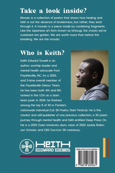 Broken...but healing. Mosaic is a collection of poetry that shows how healing and faith is not the absence of brokenness, but rather, they exist through it. A mosaic is a piece made by combining fragments. Like the Japanese art form known as kintsugi, the cracks we've sustained are golden. We are worth more than before the breaking. We are the mosaic.