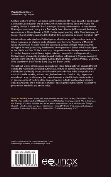 Graham Collier’s career in jazz lasted over five decades. He was a bassist, a band-leader, a composer, an educator and an author, who wrote extensively about the music. His working life was littered with ‘firsts’. Amongst his many achievements, he was the first British jazz musician to study at the Berklee School of music in Boston and the first to receive an Arts Council grant. In 1985, Collier began teaching at the Royal Academy of Music, where he later established the first full-time jazz degree course in the UK in 1987. Mosaics draws extensively on Collier’s personal archive, as well as on interviews with fellow musicians, ex-students and colleagues from the Royal Academy of Music. It locates Collier and his work within the social and cultural changes which occurred during his life and, particularly, in relation to developments in British and European jazz of the 1960s and 70s. Collier’s work as a composer-bandleader represented an attempt to resolve the paradoxes inherent in jazz between composition and improvisation, familiarity and spontaneity and change and tradition. In this regard, Mosaics compares Collier’s work with other composers such as Duke Ellington, Charles Mingus, Gil Evans, Mike Westbrook, Stan Tracey, Barry Guy and Butch Morris. Throughout, Collier emerges as a contradictory figure falling between several different camps. He was never an out-and-out musical, cultural or political radical but rather an individualist continually forced to confront the contradictions in his own position – a musical outsider working within a marginalised area of cultural activity; a gay man operating in a very male area of the music business and within heterosexist culture in general; a man of working class origins stepping outside traditionally prescribed class boundaries; and a musician-composer seeking individual solutions to collective problems of aesthetic and ethical value.