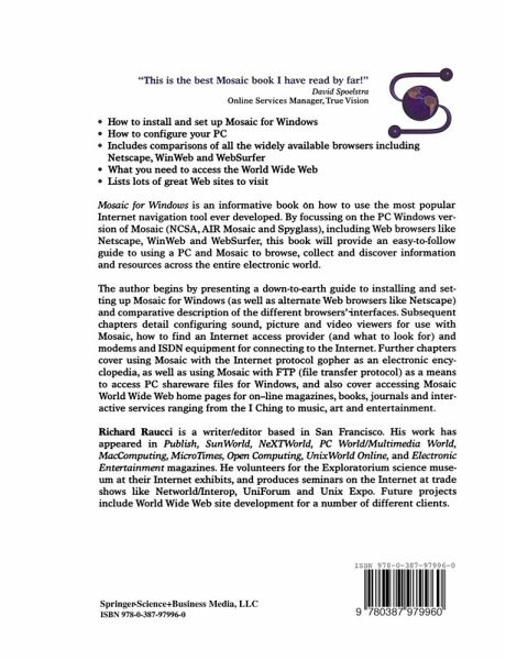 Mosaic for Windows is an informative book on how to use the most popular Internet navigation tool ever developed. By focussing on the PC Windows version of Mosaic (NCSA, AIR Mosaic, and Spyglass), including Web browsers like NetScape, WinWeb and WebSurfer, this book will provide an easy-to-follow guide to using a PC and Mosaic to browse, collect, and discover information and resources across the entire electronic world.