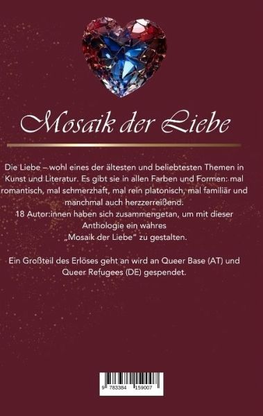 "Mosaik der Liebe" zelebriert Liebe in allen Formen und Farben: romantisch, platonisch, familiär, die Liebe zum Haustier und die Liebe zum Sternenkind. Mal amüsant, mal traurig, mal ganz klassisch und auch mal toxisch. Die Autor:innen gestalten zusammen ein wahres Mosaik an verschiedenen Geschichten.