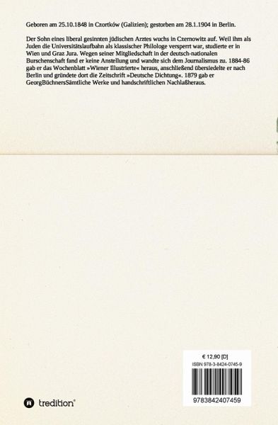Geboren am 25.10.1848 in Czortków (Galizien); gestorben am 28.1.1904 in Berlin. Der Sohn eines liberal gesinnten jüdischen Arztes wuchs in Czernowitz auf. Weil ihm als Juden die Universitätslaufbahn als klassischer Philologe versperrt war, studierte er in Wien und Graz Jura. Wegen seiner Mitgliedschaft in der deutsch-nationalen Burschenschaft fand er keine Anstellung und wandte sich dem Journalismus zu. 1884-86 gab er das Wochenblatt 'Wiener Illustrierte' heraus, anschließend übersiedelte er nach Berlin und gründete dort die Zeitschrift 'Deutsche Dichtung'. 1879 gab er Georg Büchners Sämtliche Werke und handschriftlichen Nachlaß heraus.