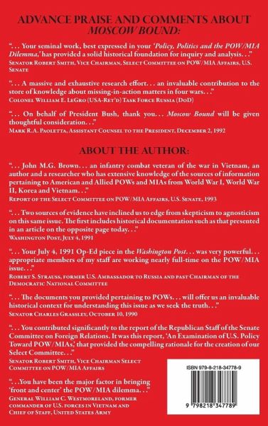 Moscow Bound is an expose of the US Government's actions, and inactions, on behalf of American POWs and MIAs between 1918 and 1993. It's findings have been cited by the US Senate Select Committee on POW/MIA Affairs, American Legion, Vietnam Veterans of America, General William Westmoreland, VFW, the Oregonian, Washington Post, and the US National Archives. It's the result of a seven year investigation by Vietnam veterans John M. G. Brown and Thomas V. Ashworth into missing American military personnel in Soviet and other Communist captivity after WW I, WW II, Korea and Vietnam. Its 1,164 pages cover:The Bolshevik Revolution, the 1918 American Intervention in Russia, and the rise of Soviet power The dictatorship of Josef Stalin (World War II), and the origins of the Cold War The Cold War to Korea From Vietnam to the collapse of the Soviet Union 90 newly declassified US documents dated from 1918 to 1993 It's original publication in 1993 completed the author's mission which he accepted while serving in combat in Vietnam throughout 1968: that if a soldier, sailor, airman or marine has knowledge of a comrade who is in enemy control, he must make every effort to recover that fellow-serviceman, or woman, as he would expect to be done for him. We dedicate this new edition to any and all surviving American prisoners of war, from every former enemy nation where they were held; the living-dead who were unable to plead their own cases before the American people.