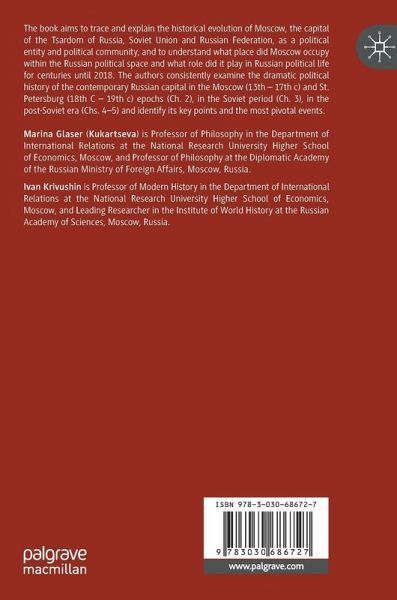 The book aims to trace and explain the historical evolution of Moscow, the capital of the Tsardom of Russia, Soviet Union and Russian Federation, as a political entity and political community, and to understand what place Moscow occupied within the Russian political space and what role it played in Russian political life for centuries until 2018. The authors consistently examine the dramatic political history of the contemporary Russian capital in the Moscow (13th - 17th centuries) and St. Petersburg (18th - 19th centuries) epochs, in the Soviet period, in the post-Soviet era, and identify its key points and the most pivotal events.