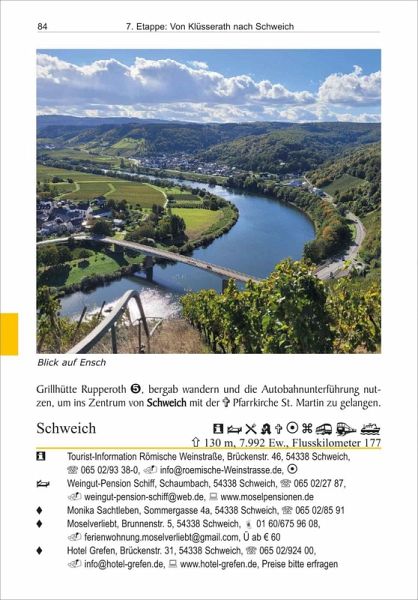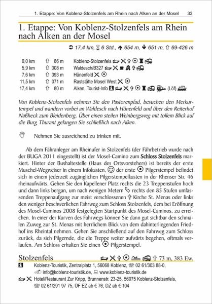 Ein besonders reizvoller Abschnitt auf dem Jakobsweg nach Santiago de Compostela ist der Mosel-Camino in Rheinland-Pfalz. Von Koblenz-Stolzenfels führt der 157 km lange Weg nach Trier, vorbei an alten Hünengräbern, imposanten Burgen, bekannten Klöstern und sehenswerten Orte wie Trarbach und Beilstein. Der Pilgerführer bietet eine detaillierte Wegbeschreibung für die Strecke entlang der Mosel, die durch Karten, Höhenprofile und GPS-Tracks ergänzt wird. Zu jeder der acht Etappen finden Sie Tipps zu Unterkünften und Informationen zu den Sehenswürdigkeiten am Weg. Einleitende Informationen zur Tradition des Pilgerns und zur Vorbereitung der Wanderung machen das Buch vollends zum perfekten Wegbegleiter.