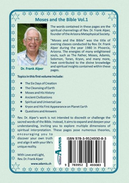 The words contained in these pages are the spiritual channelings of Rev. Dr. Frank Alper, founder of the Arizona Metaphysical Society. "Moses and the Bible" was the title of evening classes conducted by Rev. Dr. Frank Alper during the year 1980 in Phoenix, Arizona. The energies of many enlightened souls, such as The Father, Moses, Adamis, Solomon, Toran, Kryon, and many more, have contributed to the divine knowledge and spiritual insights contained within these pages. Topics in this first volume include: The Six Days of Creation The Cleansing of Earth Moses and His History Ancient Civilizations Spiritual and Universal Law Kryon and His First Appearance on Planet Earth Questions and Answers Rev. Dr. Alper's work is not intended to discredit or challenge the sacred words of the Bible. Instead, it aims to expand and deepen your understanding, inviting you to explore multiple dimensions of spiritual interpretation. These pages pose numerous theories, encouraging you to discover your own truth and align it with your life's unique reality. With Love and Light, Rev. Dr. Frank Alpe