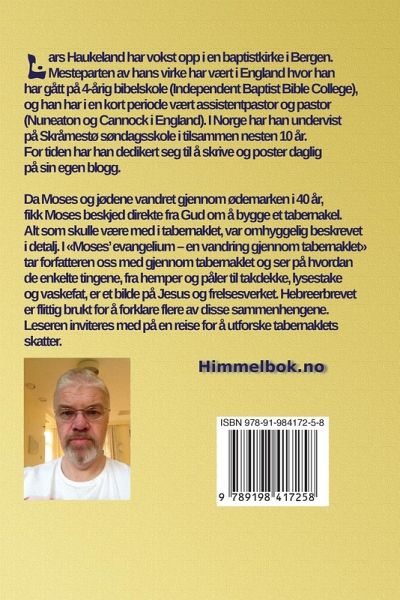 Lars Haukeland har vokst opp i en baptistkirke i Bergen. Mesteparten av hans virke har vært i England hvor han har gått på 4-årig bibelskole på Independent Baptist Bible College, og han har i en kort periode vært assistentpastor og pastor i Nuneaton og Cannock i England. I Norge har han undervist på Skråmestø søndagsskole i tilsammen nesten ti år. For tiden har han dedikert seg til å skrive og poster daglig på sin egen blogg. Da Moses og jødene vandret gjennom ødemarken i 40 år, fikk Moses beskjed direkte fra Gud om å bygge et tabernakel. Alt som skulle være med i tabernaklet, var omhyggelig beskrevet i detalj. I Moses Evangelium - en vandring gjennom tabernaklet tar forfatteren oss med gjennom tabernaklet og ser på hvordan de enkelte tingene, fra hemper og påler til takdekke, lysestake og vaskefat, er et bilde på Jesus og frelsesverket. Hebreerbrevet er flittig brukt for å forklare flere av disse sammenhengene.