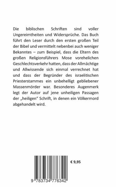 Die biblischen Schriften sind voller Ungereimtheiten und Widersprüche. Das Buch führt den Leser durch den ersten großen Teil der Bibel und vermittelt nebenbei auch weniger Bekanntes - zum Beispiel, dass die Eltern des großen Religionsführers Mose vorehelichen Geschlechtsverkehr hatten, dass der Allmächtige und Allwissende sich einmal verrechnet hat und dass der Begründer des israelitischen Priesterstammes ein unbehelligt gebliebener Massenmörder war. Besonderes Augenmerk legt der Autor auf jene unheiligen Passagen der "heiligen" Schrift, in denen ein Völkermord abgehandelt wird.