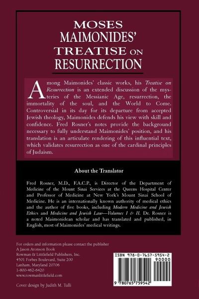One of Maimonides' classic works, the Treatise on Resurrection is an extended discussion of resurrection, the immortality of the soul, the mysteries of the Messianic Age, and the World to Come. The Treatise on Resurrection was controversial in its day for its departure from accepted Jewish theology. Despite opposition to his ideas, Maimonides defended his view with skill and confidence. Fred Rosner's notes provide the background necessary to fully understand Maimonides' position, and his translation is an articulate rendering of this influential text, which validates resurrection as one of the cardinal principles of Judaism.