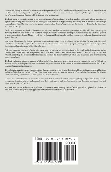 "Moses: The Journey to Freedom" is a captivating and inspiring retelling of the timeless biblical story of Moses and the liberation of the Israelites from slavery in Egypt. This compelling narrative takes readers on a transformative journey through the depths of oppression, the rise of a chosen leader, and the remarkable deliverance of an entire nation. The book begins by immersing readers in the historical context of ancient Egypt-a land of grandeur, power, and cultural magnificence. Against this backdrop, the narrative explores the origins of the Israelites in Egypt, tracing their lineage back to Joseph and the blessings bestowed upon them. The stage is set for the gradual escalation of the Israelites' oppression and the rise of a new Pharaoh, who views them as a threat to his reign. As the Israelites endure the harsh realities of forced labor and bondage, their suffering intensifies. The Pharaoh's decree, ordering the drowning of Hebrew male infants in the Nile River, plunges the Israelite community into despair. However, amidst the darkness, a glimmer of hope emerges in the form of Moses-a child born to Amram and Jochebed, who are filled with unwavering faith and determination to protect their son. In a remarkable twist of fate, Moses is preserved by divine intervention. Placed in a basket and set adrift on the Nile, he is discovered and adopted by Pharaoh's daughter. This unexpected turn of events sets Moses on a unique path, growing up as a prince of Egypt while simultaneously becoming aware of his Hebrew heritage. As Moses matures, a deep sense of justice stirs within him. He witnesses the oppression faced by his people and is driven to take action. Guided by encounters with God and profound revelations, Moses embarks on a transformative journey of self-discovery. He confronts Pharaoh, demanding the liberation of the Israelites, and becomes the instrument through which God unleashes a series of awe-inspiring plagues upon Egypt. The book explores the trials and triumphs of Moses and the Israelites as they traverse the wilderness, encountering tests of faith, divine miracles, and the unfolding of God's plan. It delves into the pivotal moment of the Exodus, as Moses leads the Israelites across the Red Sea, escaping the pursuing Egyptian army. Throughout this gripping narrative, readers witness the transformative power of faith, the indomitable spirit of a people seeking liberation, and the unfailing love and guidance of God. The story of Moses serves as a powerful reminder of the enduring human quest for freedom and the unwavering commitment of a divine power to deliver and redeem. "Moses: The Journey to Freedom" captivates readers with its rich historical context, vivid storytelling, and profound themes of faith, courage, and liberation. It invites readers to reflect on their own journeys, confront the chains that bind them, and embrace the hope and transformative power of God's love. This book is a testament to the timeless significance of the story of Moses, inspiring readers of all backgrounds to explore the depths of their own faith, confront their personal struggles, and trust in the promise of liberation and freedom.
