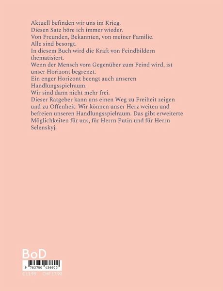 Aktuell befinden wir uns im Krieg.Diesen Satz höre ich immer wieder.Von Freunden, Bekannten, von meiner Familie.Alle sind besorgt.In diesem Buch wird die Kraft von Feindbildern thematisiert.Wenn der Mensch vom Gegenüber zum Feind wird, ist unser Horizont begrenzt.Ein enger Horizont beengt auch unseren Handlungsspielraum.Wir sind dann nicht mehr frei.Dieser Ratgeber kann uns einen Weg zu Freiheit zeigen und zu Offenheit. Wir können unser Herz weiten und befreien unseren Handlungsspielraum. Das gibt erweiterte Möglichkeiten für uns, für Herrn Putin und für Herrn Selenskyj.