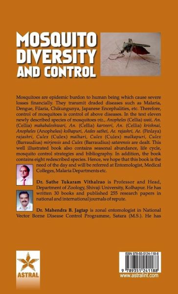 Mosquitoes are epidemic burden to human being which cause severe losses financially. They transmit traded diseases such as Malaria, Dengue, Filaria, Chikungunya, Japanese Encephalities, etc. Therefore, control of mosquitoes is control of above diseases. In the text eleven newly described species of mosquitoes viz., Anopheles (Cellia) Krishnai, Anopheles (Anopheles) kolhapuri, Aedes Sathei, Ae. rajashri, Ae. (Finlaya) rajashri, Culex (Culex) malhari, Culex (Culex) malkapuri, Culex (Barraudius) mirjensis and Culex (Barraaudius) satarensis are dealt. This well illustrated book also contains seasonal abundance, life cycle, mosquito control strategies and bibliography. In addition, the book contains eight redescribed species. Hence, we hope that this book is the need of the day and will be referred at Entomologist, Medical Colleges, Malaria Departments etc.
