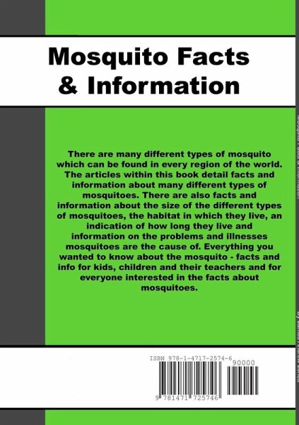 There are many different types of mosquito which can be found in every region of the world. The articles within this book details facts and information about many different types of mosquitoes. There are also facts and information about the size of the different types of mosquitoes, the habitat in which they live, an indication of how long they live and information on the problems and illnesses mosquitoes are the cause of. Everything you wanted to know about the mosquito - facts and info for kids, children and their teachers and for everyone interested in the facts about mosquitoes.