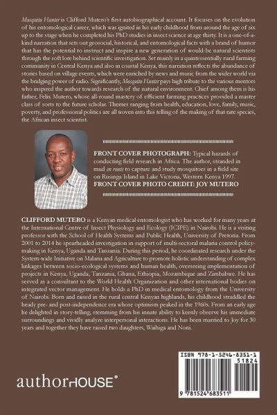 Mosquito Hunter is Clifford Mutero?s first autobiographical account. It focuses on the evolution of his entomological career, which was ignited in his early childhood from around the age of six up to the stage when he completed his PhD studies in insect science at age thirty. It is a one-of-a-kind narration that sets out geosocial, historical, and entomological facts with a brand of humor that has the potential to instruct and inspire a new generation of would-be natural scientists through the soft lore behind scientific investigation. Set mainly in a quintessentially rural farming community in Central Kenya and also in coastal Kenya, this narration reflects the abundance of stories based on village events, which were enriched by news and music from the wider world via the bridging power of radio. Significantly, Mosquito Hunter pays high tribute to the various mentors who inspired the author towards research of the natural environment. Chief among them is his father, Felix Mutero, whose all-round mastery of efficient farming practices provided a master class of sorts to the future scholar. Themes ranging from health, education, love, family, music, poverty, and professional politics are all woven into this telling of the making of that rare species, the African insect scientist.~