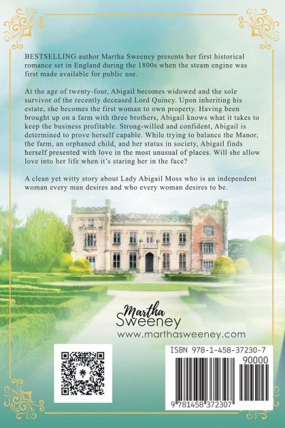 BESTSELLING Author Martha Sweeney presents her first historical romance set in England during the 1800s when the steam engine was first made available for public use. (Paperbacks available via my website) At the age of twenty-four, Abigail becomes widowed and the sole survivor of the recently deceased Lord Quincy. Upon inheriting his estate, she becomes the first women to own property. Having been brought up on a farm with three brothers, Abigail knows what it takes to keep the business profitable. Strong willed and confident, Abigail is determined to prove herself capable. While trying to balance the Manor, the farm, an orphaned child, and her status in society, Abigail finds herself presented with love in the most unusual of places. Will she allow love into her life when it's staring her in the face? A clean yet witty story about Lady Abigail Moss who is an independent woman every man desires and who every woman desires to be.