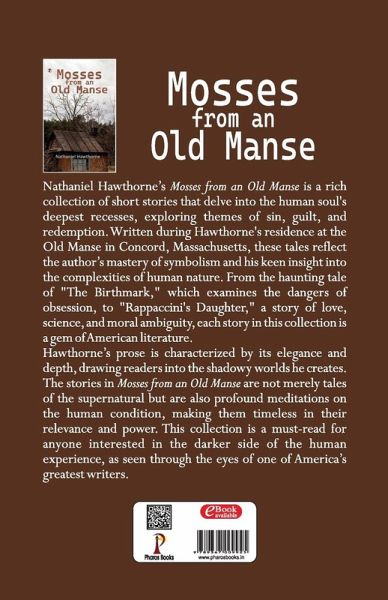 Nathaniel Hawthorne's Mosses from an Old Manse is a rich collection of short stories that delve into the human soul's deepest recesses, exploring themes of sin, guilt, and redemption. Written during Hawthorne's residence at the Old Manse in Concord, Massachusetts, these tales reflect the author's mastery of symbolism and his keen insight into the complexities of human nature. From the haunting tale of ""The Birthmark,"" which examines the dangers of obsession, to ""Rappaccini's Daughter,"" a story of love, science, and moral ambiguity, each story in this collection is a gem of American literature. Hawthorne's prose is characterized by its elegance and depth, drawing readers into the shadowy worlds he creates. The stories in Mosses from an Old Manse are not merely tales of the supernatural but are also profound meditations on the human condition, making them timeless in their relevance and power. This collection is a must read for anyone interested in the darker side of the human experience, as seen through the eyes of one of America's greatest writers.