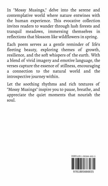 In "Mossy Musings," delve into the serene and contemplative world where nature entwines with the human experience. This evocative collection invites readers to wander through lush forests and tranquil meadows, immersing themselves in reflections that blossom like wildflowers in spring. Each poem serves as a gentle reminder of life's fleeting beauty, exploring themes of growth, resilience, and the soft whispers of the earth. With a blend of vivid imagery and emotive language, the verses capture the essence of stillness, encouraging a connection to the natural world and the introspective journey within. Let the soothing rhythms and rich textures of "Mossy Musings" inspire you to pause, breathe, and appreciate the quiet moments that nourish the soul.