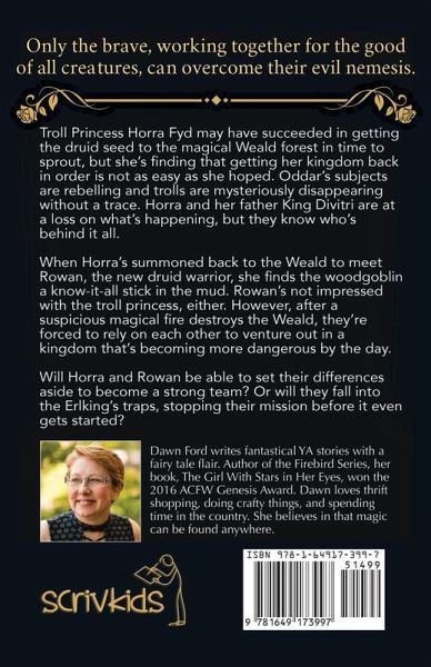 Troll Princess Horra Fyd may have succeeded in getting the druid seed to the magical Weald forest in time to sprout, but she's finding that getting her kingdom back in order is not as easy as she hoped. Oddar's subjects are rebelling and trolls are mysteriously disappearing without a trace. Horra and her father King Divitri are at a loss on what's happening, but they know who's behind it all. When Horra's summoned back to the Weald to meet Rowan, the new druid warrior, she finds the woodgoblin a know-it-all stick in the mud. Rowan's not impressed with the troll princess, either. However, after a suspicious magical fire destroys the Weald, they're forced to rely on each other to venture out in a kingdom that's becoming more dangerous by the day. Will Horra and Rowan be able to set their differences aside to become a strong team? Or will they fall into the Erlking's traps, stopping their mission before it even gets started?