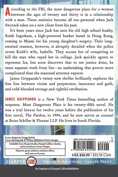 According to the FBI, the most dangerous place for a woman between the ages of twenty and thirty is in a relationship with a man. Those statistics become all too personal when Jack Swyteck takes on a new client from his past. It’s been years since Jack has seen his old high school buddy, Keith Ingraham, a high-powered banker based in Hong Kong, coming to Miami for his young daughter’s surgery. Their long-awaited reunion, however, is abruptly derailed when the police arrest Keith’s wife, Isabelle. They accuse her of conspiring to kill the man who raped her in college. Jack quickly agrees to represent Isa, but soon discovers that to see justice done, he must separate truth from lies—an undertaking that proves more complicated than the seasoned attorney expects. James Grippando’s twisty new thriller brilliantly explores the fine line between victim and perpetrator, innocence and guilt, and cold-blooded revenge and rightful retribution.