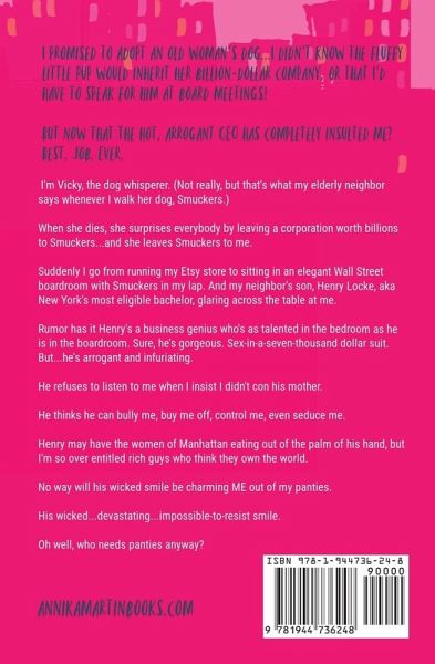OMG - the cute little dog I adopted turns out to be a billionaire Maltese! That's right, my tiny dog just inherited giant corporation! ...and the jerky CEO? Not amused. I'm Vicky, the dog whisperer. (Not really, but that's what my elderly neighbor says whenever I walk her dog, Smuckers.)When she dies, she surprises everybody by leaving a corporation worth billions to Smuckers...and she leaves Smuckers to me. Suddenly I go from running my Etsy store to sitting in an elegant Wall Street boardroom with Smuckers in my lap. And my neighbor's son, Henry Locke, aka New York's most eligible bachelor, glaring across the table at me. Rumor has it Henry's a business genius who's as talented in the bedroom as he is in the boardroom. Sure, he's gorgeous. Sex-in-a-seven-thousand dollar suit. But...He's arrogant and infuriating. He refuses to listen to me when I insist I didn't con his mother. He thinks he can bully me, buy me off, control me, even seduce me. Henry may have the women of Manhattan eating out of the palm of his hand, but I'm so over entitled rich guys who think they own the world. No way will his wicked smile be charming ME out of my panties. His wicked...devastating...impossible-to-resist smile. Oh well, who needs panties anyway?