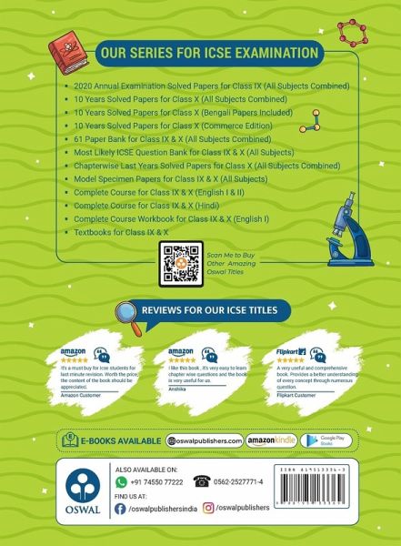 Benefit from Category wise & Chapterwise Question Bank Series for Class 10 ICSE Board Examinations (2022) with our Most Likely ICSE Question Bank for Biology. Subjectwise book dedicated to prepare and practice effectively each subject at a time. Consist of Biology subject - having name the following, give technical terms, fill in the blanks, mcqs, match the following, state the location, state the function, short questions, sketch and label the diagrams, diagram based questions, etc. Our handbook will help you study and practice well at home. Why should you trust Oswal Books - Oswal Publishers? Oswal Publishers has been in operation since 1985. Over the past 30 years, we have developed content that aids students and teachers in achieving excellence in education. We create content that is extensively researched, meticulously articulated, and comprehensively edited - catering to the various National and Regional Academic Boards in India. How can you benefit from Oswal Most Likely ICSE Biology Question Bank for 10th Class? Our handbook is strictly based on the latest syllabus prescribed by the council and is categorized chapterwise topicwise to provides in depth knowledge of different concept questions and their weightage to prepare you for Class 10th ICSE Board Examinations 2022. Having one subject per book, including chapter at a glance, word of advice by experts, each category of our question bank covers the entire syllabus at a time. Apart from study material, frequently asked previous year's board questions, and insightful answering tips and suggestions for students, our question bank also consists of numerous tips and tools to improve study techniques for any exam paper. Students can create vision boards to establish study schedules, and maintain study logs to measure their progress. With the help of our handbook, students can also identify patterns in question types and structures, allowing them to cultivate more efficient answering methods. Our book can also help in providing a comprehensive overview of important topics in each subject, making it easier for students to solve for the exams.