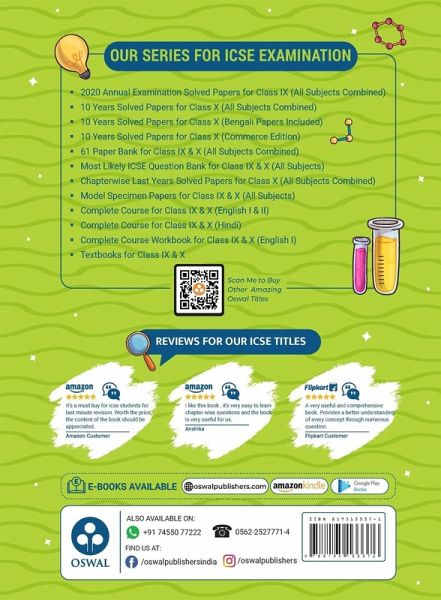 Benefit from Category wise & Chapterwise Question Bank Series for Class 10 ICSE Board Examinations (2022) with our Most Likely ICSE Question Bank for Chemistry. Subjectwise book dedicated to prepare and practice effectively each subject at a time. Consist of Chemistry subject - having fill in the blanks, match the column, mcqs, one word or chemical term, identification of gases, state the observation, define and explain the following, IUPAC Nomenclature, short answers, numericals, chemical tests, figure or table based questions, balancing and writing the structural formula, etc. Our handbook will help you study and practice well at home. Why should you trust Oswal Books - Oswal Publishers? Oswal Publishers has been in operation since 1985. Over the past 30 years, we have developed content that aids students and teachers in achieving excellence in education. We create content that is extensively researched, meticulously articulated, and comprehensively edited - catering to the various National and Regional Academic Boards in India. How can you benefit from Oswal Most Likely ICSE Chemistry Question Bank for 10th Class? Our handbook is strictly based on the latest syllabus prescribed by the council and is categorized chapterwise topicwise to provides in depth knowledge of different concept questions and their weightage to prepare you for Class 10th ICSE Board Examinations 2022. Having one subject per book, including chapter at a glance, word of advice by experts, each category of our question bank covers the entire syllabus at a time. Apart from study material, frequently asked previous year's board questions, and insightful answering tips and suggestions for students, our question bank also consists of numerous tips and tools to improve study techniques for any exam paper. Students can create vision boards to establish study schedules, and maintain study logs to measure their progress. With the help of our handbook, students can also identify patterns in question types and structures, allowing them to cultivate more efficient answering methods. Our book can also help in providing a comprehensive overview of important topics in each subject, making it easier for students to solve for the exams.