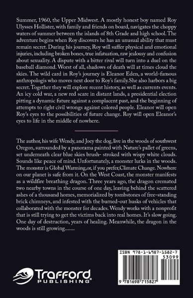 Summer, 1960, the Upper Midwest. A mostly honest boy named Roy Ulysses Hollister, with family and friends on board, navigates the choppy waters of summer between the islands of 8th Grade and high school. The adventure begins when Roy discovers he has an unusual ability that must remain secret. During his journey, Roy will suffer physical and emotional injuries, including broken bones, true infatuation, raw jealousy and confusion about sexuality. A dispute with a bitter rival will turn into a duel on the baseball diamond. Worst of all, shadows of death will at times cloud the skies. The wild card in Roy's journey is Eleanor Eden, a world-famous anthropologis who moves next door to Roy's family.She also harbors a big secret. Together they will explore recent history, as well as currents events. An icy cold war, a new red scare in distant lands, a presidential election pitting a dynamic future against a complacent past, and the beginning of attempts to right civil wrongs against colored people. Eleanor will open Roy's eyes to the possibilities of future change. Roy will open Eleanor's eyes to life in the middle of nowhere.