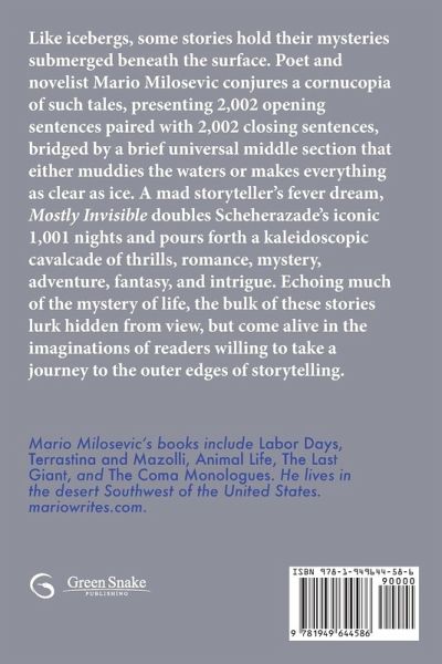 Like icebergs, some stories hold their mysteries submerged beneath the surface. Poet and novelist Mario Milosevic conjures a cornucopia of such tales, presenting 2,002 opening sentences paired with 2,002 closing sentences, bridged by a brief universal middle section that either muddies the waters or makes everything as clear as ice. A mad storyteller’s fever dream, Mostly Invisible doubles Scheherazade’s iconic 1,001 nights and pours forth a kaleidoscopic cavalcade of thrills, romance, mystery, adventure, fantasy, and intrigue. Echoing much of the mystery of life, the bulk of these stories lurk hidden from view, but come alive in the imaginations of readers willing to take a journey to the outer edges of storytelling.