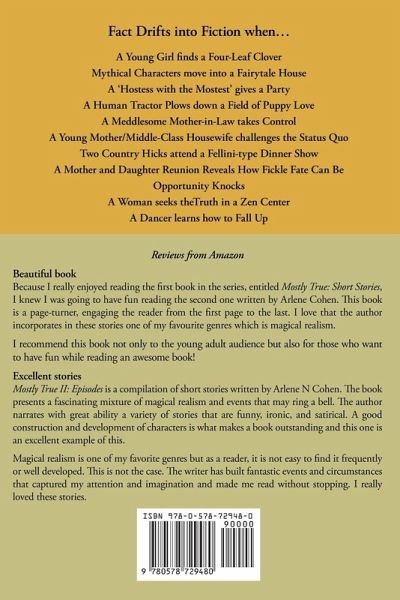 More outrageous and humorous experiences with a twist of satire and magical realism await you in Mostly True II: Episodes like those that appeared in Mostly True: Short Stories. Enjoy that bumpy trek called "Life", once again from the lady whose days have been punctuated by acute moments of disbelief! In Breathless, a young and carefree child of four who frolics with the neighbor's dog finds out that four-leaf clovers don't always work as expected. The cast of characters in Fairytale House is something to write home about if you don't live there. Greta, the Hostess with the Mostess is confident that keeping up appearances is a good substitute for Seeing is Believing. In Young Love a human tractor in high gear plows down an outgrowth of puppy love. Instead of 'Baby makes three', in the story The Baby Maker, baby makes four with the addition of a meddlesome mother-in-law, a done deal. Civil Disobedience is about the price a middle-class house wife, a young mother pays when she challenges the status quo. The Dinner Show is a madcap courtroom spectacle, like something out of a Fellini film. The Glimpse, a mother and daughter's reunion reveals how fickle fate can be. When Opportunity Knocks, a woman ditches her unsavory past for a new beginning in Paradise. A Zen Meditation Center is where a confused woman goes to figure out her life and learns how to Dance in the Void. In The Light Fantastic, a dancer is taught a way to gracefully rebound after years of falling and feeling stuck.