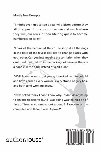 Mostly True Excerpts "I might even get to see a real wild bison before they all disappear into a zoo or commercial ranch where they will join cows in their lifelong quest to become hamburger or jerky." "Think of the bedlam at the coffee shop if all the dogs in the back of the trucks decided to change places with each other. Can you just imagine the confusion when they can’t find their pickup in the parking lot because there is a poodle in the back instead of a pit bull?" "Well, I don’t want to get young. I worked hard to get old and have earned every wrinkle, every strand of grey hair, and both semi-working knees." "I was poked today. I don’t know why. I didn’t do anything to anyone to deserve it. All I was doing was taking a bit of time off from my chores to look around in Facebook on my computer, and there it was. A poke!"