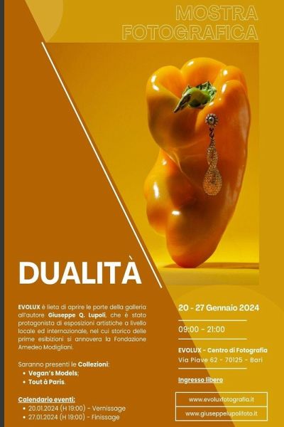 "EVOLUX - Centro Polifunzionale di Fotografia di Domenico Fornarelli" è lieta di presentare la mostra di arte fotografica "Dualità" aprendo le porte della galleria all'autore Giuseppe Q. Lupoli che è stato protagonista di esposizioni artistiche a livello locale ed internazionale, nel cui storico delle prime esibizioni si annovera la Fondazione Amedeo Modigliani. La mostra si terrà a Bari in Via Piave 62 al piano terra dal 20 al 27 Gennaio 2024 e presenterà due collezioni: "Vegan's Models" e "Tout à Paris". Le due collezioni presentate sembrano apparentemente dotate di differente identità poiché appartengono a due generi, processi e linguaggi differenti. Infatti, da un lato l'autore non fornisce risposte, ma pone domande nel sistema consumistico; dall'altro cattura istantanee e fascinose atmosfere di un'elegante città senza tempo. A ben vedere, in realtà, i due progetti sono unitari e complementari, la cui chiave di lettura è concettuale, rendendo lo spettatore direttamente coinvolto. Sabato 20 Gennaio 2024 alle ore 19:00 si terrà il vernissage della mostra con un buffet ed un rinfresco per la presentazione di tutti i protagonisti coinvolti e si invita alla partecipazione. Nei giorni successivi sarà possibile visionare le opere con un'eventuale conversazione con l'autore su richiesta. Sabato 27 Gennaio 2024 alle ore 19:00 si terrà il finissage, in cui si ringrazieranno tutti coloro che hanno voluto partecipare.