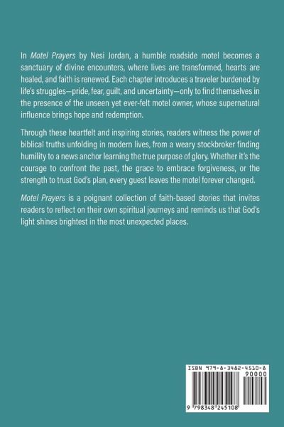 Motel Prayers by Nesi Jordan is set in a humble roadside motel that becomes a sanctuary of divine encounters where lives are transformed, hearts are healed, and faith is renewed. Each chapter introduces a traveler burdened by life's struggles-pride, fear, guilt, and uncertainty-only to find themselves in the presence of the unseen yet ever-felt motel owner, whose supernatural influence brings hope and redemption.