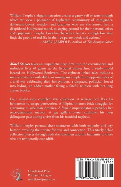 The fictional Sunset Inn is a seedy motel with a storied past on a neglected block of Hollywood Boulevard. In twenty linked tales, Motel Stories takes an empathetic deep dive into the eccentricities and troubled lives of the diverse guests who check in to this refuge of last resort-for either pleasure or escape, and always an interrupted night's sleep. Edward, the motel's cynical but occasionally accommodating manager, confronts a daily cast of ever-changing characters. A man who dances with dolls. Central American immigrants from civil war celebrating their honeymoon. The addict mother of a newborn infant facing a fateful reunion with her long-lost brother. A disgraced politician forced into hiding. A Vietnamese mama's boy waiting to meet his foreign bride. An elderly couple checking in to the same room where they first met sixty years earlier. ¿Four interrelated stories complete the collection. A Filipina internet bride struggles to maintain her autonomy in suburban America. A teenage boy flees his hometown to escape persecution. A female impersonator replaces her glamorous mentor on stage. A gay, middle-aged gallery owner confronts his own errant past when his troubled teenage nephew visits. William Torphy portrays these characters with both empathy and wry humor, revealing their universal desire for love and connection, recognition and security. Sometimes raw, and often humorous, this timely debut collection pierces through both the loneliness and the humanity of distressed outliers temporarily set adrift by circumstance in the American underbelly.