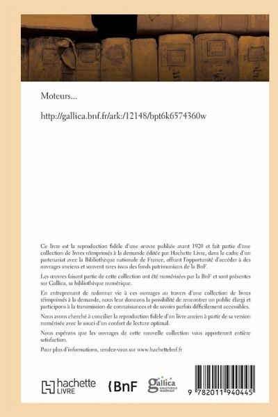 Moteurs... Date de l'édition originale: 1910 Le présent ouvrage s'inscrit dans une politique de conservation patrimoniale des ouvrages de la littérature Française mise en place avec la BNF. HACHETTE LIVRE et la BNF proposent ainsi un catalogue de titres indisponibles, la BNF ayant numérisé ces oeuvres et HACHETTE LIVRE les imprimant à la demande. Certains de ces ouvrages reflètent des courants de pensée caractéristiques de leur époque, mais qui seraient aujourd'hui jugés condamnables. Ils n'en appartiennent pas moins à l'histoire des idées en France et sont susceptibles de présenter un intérêt scientifique ou historique. Le sens de notre démarche éditoriale consiste ainsi à permettre l'accès à ces oeuvres sans pour autant que nous en cautionnions en aucune façon le contenu. Pour plus d'informations, rendez-vous sur www.hachettebnf.fr