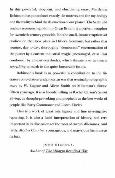 In this powerful, eloquent, and elucidating essay, Marilynne Robinson has pinpointed exactly the motives and the mythology and the reality behind the destruction of our planet. The Sellafield nuclear reprocessing plant in Great Britain is a perfect metaphor for twentieth-century genocide. Not the small, insane eruptions of eradication that took place in Hitler's Germany, but rather that routine, day-to-day, thoroughly "democratic" envenomation of the planet by a current industrial magic (encouraged, or at least condoned, by almost everybody), which threatens to terminate everything on earth in the quite foreseeable future. Robinson's book is as powerful a contribution to the literature of revelation and protest as was that seminal photographic essay by W. Eugene and Aileen Smith on Minamata's disease fifteen years ago. It is as bloodcurdling as Rachel Carson's Silent Spring, as thought-provoking and prophetic as the best works of people like Barry Commoner and Loren Eiseley. This is a work of great intelligence and fine investigative reporting. It is also a lucid interpretation of history, and very important in its discussions of the roots of current dilemmas. And lastly, Mother Country is courageous, and marvelous literature at its best.