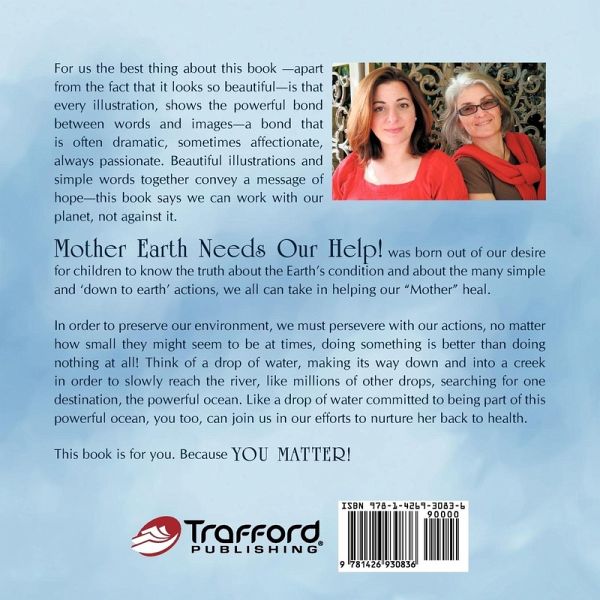 For us the best thing about this book -apart from the fact that it looks so beautiful-is that every illustration, shows the powerful bond between words and images-a bond that is often dramatic, sometimes affectionate, always passionate. Beautiful illustrations and simple words together convey a message of hope-this book says we can work with our planet, not against it. Mother Earth Needs Our Help! was born out of our desire for children to know the truth about the Earth's condition and about the many simple and 'down to earth' actions, we all can take in helping our "Mother" heal. In order to preserve our environment we must persevere with our actions, no matter how small they might seem to be at times, doing something is better than doing nothing at all! Think of a drop of water, making its way down and into a creek in order to slowly reach the river, like millions of other drops, searching for one destination, the powerful ocean. Like a drop of water committed to being part of this powerful ocean, you too can join us in our efforts to nurture her back to health. This book is for you. Because you matter.
