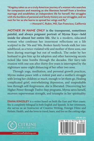 Mother in Name Only is the transparent, sometimes painful, and always poignant portrait of Myrna Kaye-held inside for almost her entire life. She is a modern, educated woman who confesses her innermost reflections on a life sculpted in the '50s and '60s. Broken family bonds stalk her into adulthood, as a twice-violated wife and mother of three sons, one born during marriage but out of wedlock. The order by her husband to give him up for adoption and other harrowing secrets ticked like time bombs through the decades. Her fairy-tale reunion with one son after thirty-five years is interrupted by the nightmare same-night distancing of her other two sons. Through yoga, meditation, and personal growth practices, Myrna makes peace with a violent past and a mother's struggle with loving her children so much, enough to let them go. Healing complicated grief, overwhelming depression, and unspeakable loss through self-forgiveness, she is liberated. Discovering her Higher Power through Twelve-Step programs, Myrna saves herself, recovers superwoman strength, and triumphs in her spirituality.