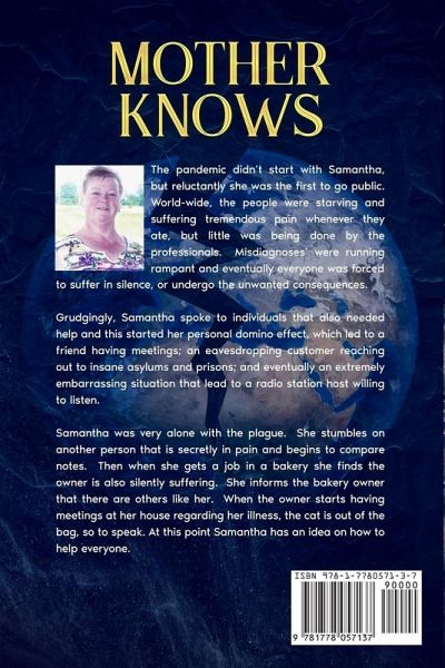 The pandemic didn't start with Samantha, but reluctantly she was the first to go public. World-wide, the people were starving and suffering tremendous pain whenever they ate, but little was being done by the professionals. Misdiagnoses were running rampant and eventually, everyone was forced to suffer in silence, or undergo the unwanted consequences. Grudgingly, Samantha spoke to individuals who also needed help and this started her personal domino effect, which led to a friend having meetings; an eavesdropping customer reaching out to insane asylums and prisons; and eventually, an extremely embarrassing situation that lead to a radio station host, willing to listen. Samantha was very alone with the plague. She stumbles on another person that is secretly in pain and begins to compare notes. Then when she gets a job in a bakery she finds the owner is also silently suffering. She informs the bakery owner that there are others like her. When the owner starts having meetings at her house regarding her illness, the cat is out of the bag, so to speak. At this point, Samantha has an idea of how to help everyone. A fiction BY: PAM BONDY.