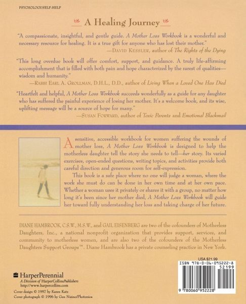 To tell you how to use this workbook would be like giving you instructions on how to grieve. Impossible. The only thing we know for sure is that no two people will approach this work in the same way. If there's one thing you should remember as you begin this process, it is this: You are not alone. With that knowledge, you've already begun to heal. --from A Mother Loss Workbook Inspired by Hope Edelman's bestselling Motherless Daughters, authors Diane Hambrook and Gail Eisenberg have created a sensitive,m accessible workbook for women suffering the wounds of early mother loss. A Mother Loss Workbook is designed to help the ,motherless daughter tell the story she needs to tell--her story. Its varied exercises, open-ended questions, writing topics, and activities, drawn from Hambrook's years of work with motherless daughters, provide both careful direction and generous room for self-expression. This book is a safe place where no one will judge a woman, where the work she must do can be done in her own time, at her own pace, and at any stage of mourning. A Mother Loss Workbook is an ideal supplement for personal therapy and support groups, but it is an important--and perhaps the only--tool for women just starting their journey or who are hesitant to go public with their feelings. Whether a woman uses it privately or shares it with a group, no matter how long its been since her mother died, A Mother Loss Workbook will guide her toward fully understanding her loss and taking charge of her future.