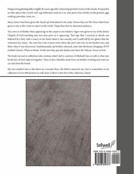 I began doing photography roughly five years ago after witnessing spiritual visions in the clouds. It expanded to other places like a brick wall, rug, bathwater, sand on a car mat, pours from drinks on the ground, eggs cooking, pancakes, toast, etc. Many times I had been given the 'heads up' beforehand to ready. I know they are His Grace that's been given to me as His works to report to the world. I hope they find an interested audience. The cover is of Mother Mary appearing on the carpet in our kitchen. Signs were given to me of Cistene chapels ceiling of God touching man two days prior to it appearing. That sign that I received at church was followed by a lady with a rosary on her hand who I met casually and I could tell by her glance that she witnessed my vision... the next day I saw it move from were she and I met over to our kitchen area and that's when it was discovered. Simultaneously my Brother returned came into the house and brought a DVD entitled Genesis- When In Rome. At the start they pan the skyline and show the Vatican. Swear to God. The book (second in collection) also co gains what I feel is a picture of Michael's face as well as what may be the face of God. Captured together. There is also a Buddha made from my Brother tracking sand into my car mat from the beach. My own mothers face is also there on a wooden floor. My Fathers name for me 'Ace' is somewhere in my collection of over 600 pictures as well. Jesus Is Here! is the first of the collection. Enjoy!