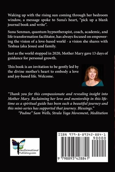 Waking up with the rising sun coming through her bedroom window, a message spoke to Suna's heart, "pick up a blank journal book and write". Suna Senman, quantum hypnotherapist, coach, academic, and life transformation facilitator, has always focused on empowering the vision of a love-based world - a vision she shares with Yeshua (aka Jesus) and family. Just as the world stopped in 2020, Mother Mary gave 13 days of guidance for personal growth. This book is an invitation to be gently led by the divine mother's heart to embody a love and joy-based life. Welcome.
