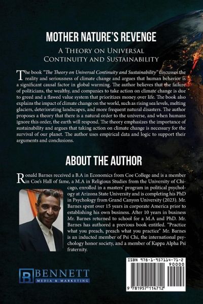 The Theory on Universal Continuity and Sustainability This book is only one of many contributions that identify the reality and seriousness of climate change in our world. Many science experts, an overwhelming number of experts and organizations, (Appendix 1) have raised the issue of the immediate necessity to address climate change but to no significant notice on the part of conservative politicians, the rich and wealthy and the companies that pollute our environment. For the average citizen, climate change explained using scientific rationale and descriptions may contain concepts that are difficult to grasp for the average citizen. It is the intent of this book to explain and address the problem of climate change in ways the average, non-scientific person can understand. Greed is a factor inhibiting climate change weighs in the failure of American and world politicians to act and support the cause to reverse the warming of our planet. What this book does is correlate the phenomena of climate change to industrialization, population increase, proliferation of fossil fuel emissions, and changes in the environmental phenomena of our world. Hypothesis there is no coincidence in the relationship between fossil fuel emissions, population increase, human behavior, industrialization, and global warming, is reinforced by the evidence presented in this book. There is a causal, stimulus / response relationship between human behavior and global warming. Why humans fail to address the issue of climate change in a significantly actionable manner indicates the shortsightedness and incompetence of our world leaders. It also indicates the frivolous casual way some people deal with the issue. One can hypothesize the value system of our world leaders and several individuals is seriously flawed in preference of money over life. One can also argue that the psychology of politicians is likewise flawed, as they operate with an incompetence that has potential to destroy our world. This book does not claim that global warming is not a significant issue with many individuals. What it does claim is that those individuals (world leaders) are lax in their responsibility to deal with the problem