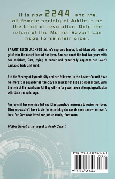 It is now 2244 and the all-female society of Arkite is on the brink of revolution. Only the return of the Mother Savant can hope to maintain order. Savant Elise Jackson, Arkite's supreme leader, is stricken with terrible grief over the recent loss of her lover. She has spent the last two years with her assistant, Sara, trying to repair and genetically engineer her lover's damaged body and mind. But the Viceroy of Pyramid City and her followers in the Savant Council have no interest in squandering the city's resources for Elise's personal gain. With the help of the mainframe AI, they will vie for power, even attempting collusion with Sara and sabotage. And even if her enemies fail and Elise somehow manages to revive her lover, Elise knows she'll have to vie for something she covets even more-her lover's love. For Sara once loved her just as much, if not more. Mother Savant is the sequel to Candy Savant.