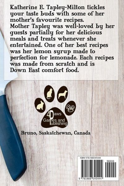 Katherine E. Tapley-Milton tickles your taste buds with some of her mother's favourite recipes. Mother Tapley was well-loved by her guests partially for her delicious meals and treats whenever she entertained. One of her best recipes was her lemon syrup made to perfection for lemonade. Each recipes was made from scratch and is Down East comfort food.