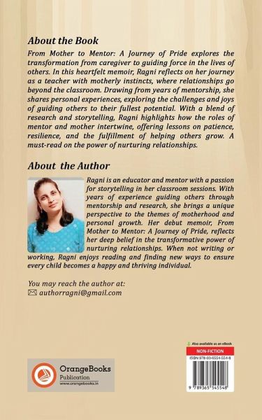From Mother to Mentor: A Journey of Pride explores the transformation from caregiver to guiding force in the lives of others. In this heartfelt memoir, Ragni reflects on her journey as a teacher with motherly instincts, where relationships go beyond the classroom. Drawing from years of mentorship, she shares personal experiences, exploring the challenges and joys of guiding others to their fullest potential. With a blend of research and storytelling, Ragni highlights how the roles of mentor and mother intertwine, offering lessons on patience, resilience, and the fulfillment of helping others grow. A must-read on the power of nurturing relationships.