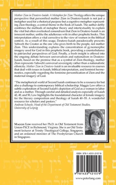 Mother Zion in Deutero-Isaiah: A Metaphor for Zion Theology offers the unique perspective that personified mother Zion in Deutero-Isaiah is not just a metaphor used for a rhetorical purpose but a cognitive metaphor representing Zion theology, a central theme in the Book of Isaiah. The author deftly combines the methods of metaphor theory and intertextuality to explain the vital but often overlooked conundrum that Zion in Deutero-Isaiah is an innocent mother, unlike the adulterous wife in other prophetic books. This interpretation offers a vital corrective to the view of women in the biblical context. As a result of this usage, Deutero-Isaiah paradoxically presents Yahweh the Creator as the one who gives birth to the people, not mother Zion. This understanding explains the concentration of gynomorphic imagery used for God in this prophetic book, providing a counterbalance to patriarchal perspectives of God. Finally, a fresh insight is offered into the ongoing debate between universalism and nationalism in Deutero-Isaiah, based on the premise that as a symbol of Zion theology, mother Zion represents Yahweh's universal sovereignty rather than a nationalistic ethnicity. Mother Zion in Deutero-Isaiah is an invaluable resource in courses that deal with issues in Isaiah, biblical interpretation, and feminist hermeneutics, especially regarding the feminine personification of Zion and the maternal imagery of God.