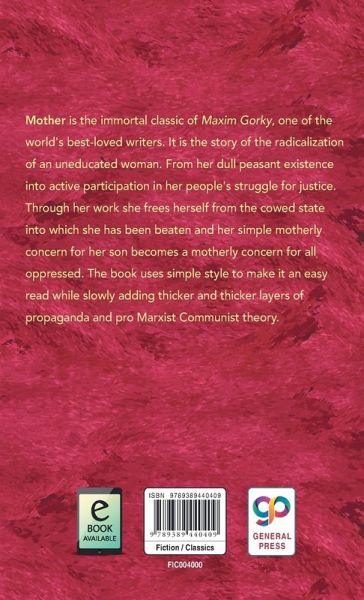 Mother' is the immortal classic of Maxim Gorky, one of the world's best-loved writers. It is the story of the radicalization of an uneducated woman. From her dull peasant existence into active participation in her people's struggle for justice. Through her work she frees herself from the cowed state into which she has been beaten and her simple motherly concern for her son becomes a motherly concern for all oppressed. The book uses simple style to make it an easy read while slowly adding thicker and thicker layers of propaganda and pro Marxist Communist theory.