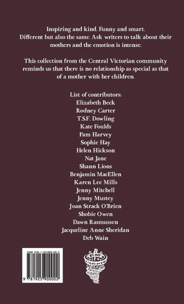 Inspiring and kind. Funny and smart. Different but also the same. Ask writers to talk about their mothers and the emotion is intense. This collection from the Central Victorian community reminds us that there is no relationship as special as that of a mother with her children. List of contributors: Elizabeth Beck Rodney Carter T.S.F. Dowling Kate Foulds Pam Harvey Sophie Hay Helen Hickson Nat Jane Shann Lions Benjamin MacEllen Karen Lee Mills Jenny Mitchell Jenny Mustey Joan Strack O’Brien Shobie Owen Dawn Rasmussen Jacqueline Anne Sheridan Deb Wain